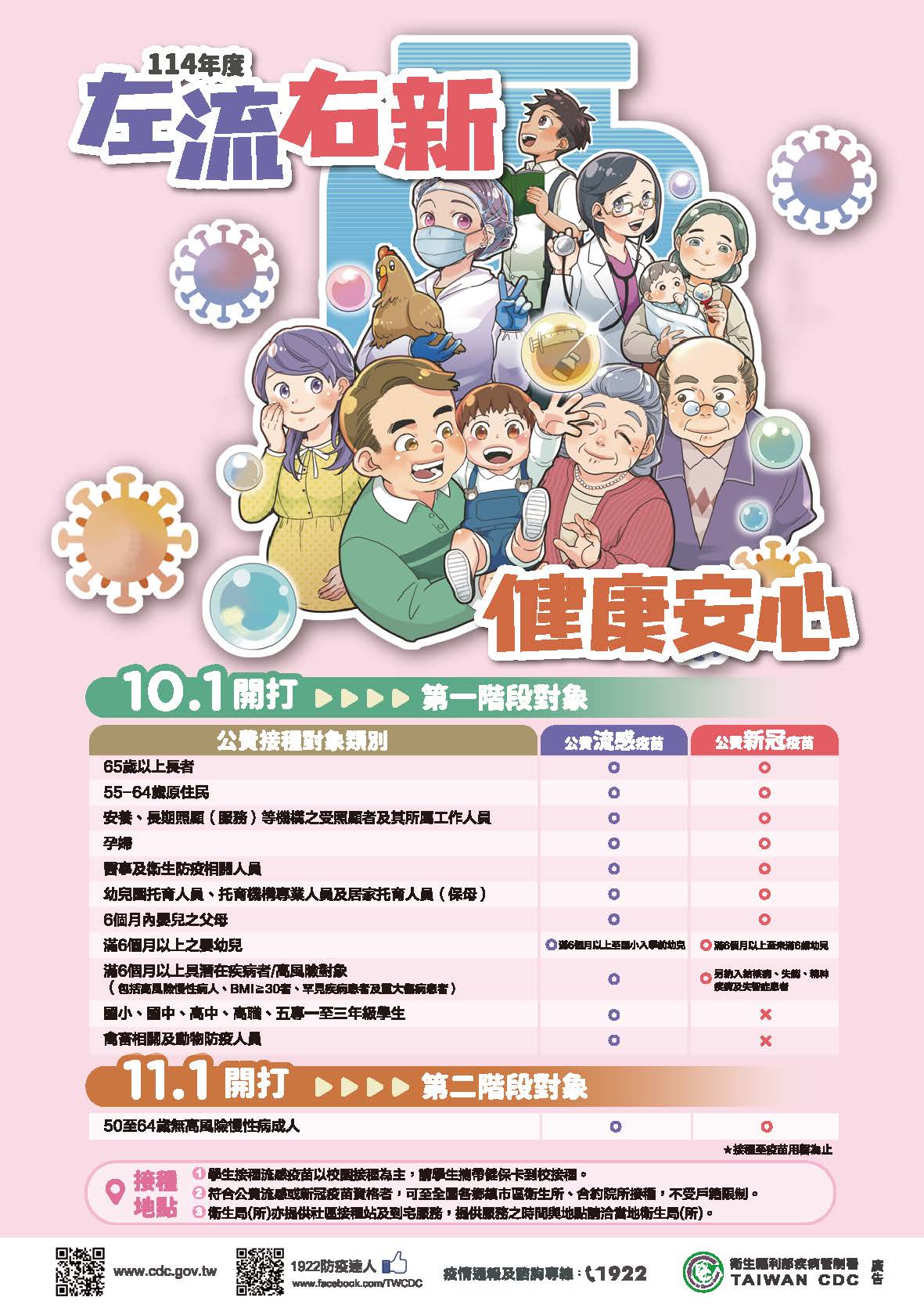 主旨:轉知衛生福利部修訂之「114-115年COVID-19疫苗接種計畫」,並自114年11月12日起提供滿12歲以上公費接種對象接種Novavax JN.1 COVID-19疫苗,請依說明辦理,請