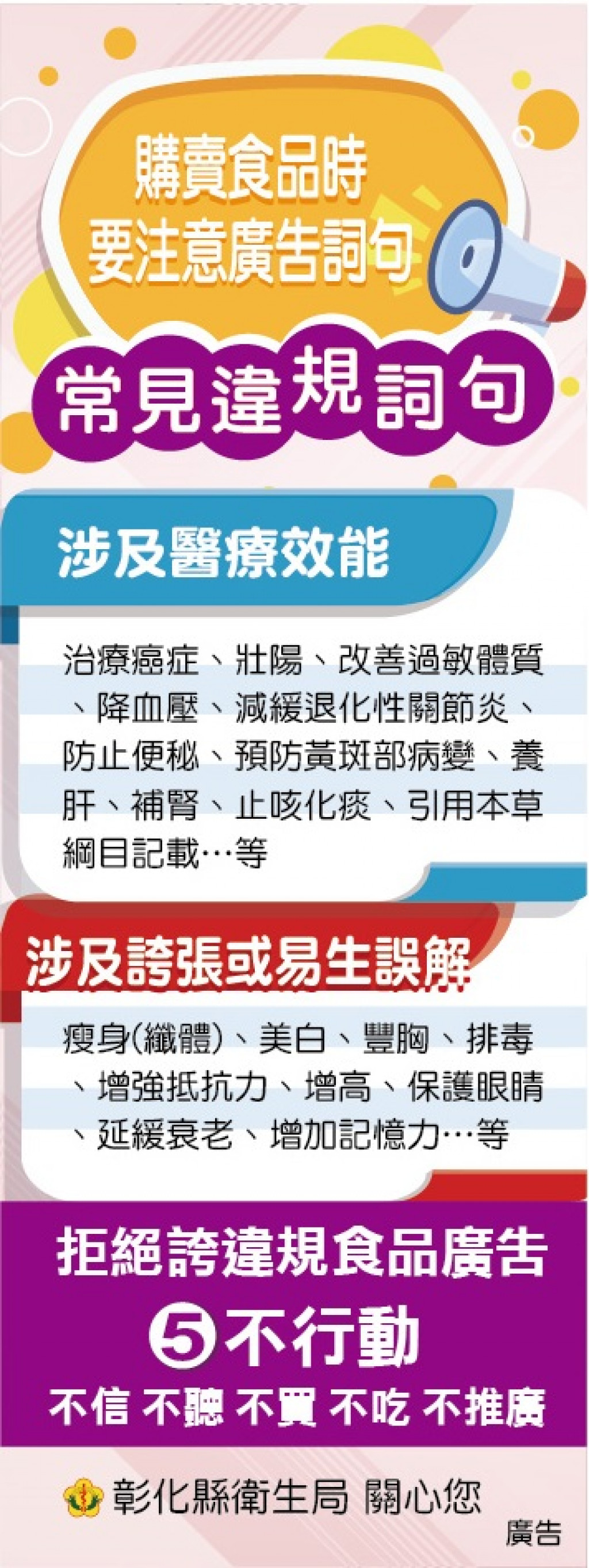 (五)食品誇大療效廣告「5不」原則,不聽、不看、不信、不買、不吃。彰化縣衛生局關心您(文字)。