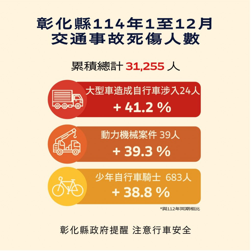 二、根據交通部道安資訊查詢網,本縣114年1-12月道路交通事故與112年同期比較分析,以大型車造成自行車涉入(含電自、電輔)事故增加41.2%最高, 動力機械案件 增加39.3%次之。少年自行車騎士(含電自、電輔) 增加38.8%再次之。1-12月份鄉鎮市30日死亡人數於「彰化市、員林市、鹿港鎮」為多,肇事熱點以「彰化市」為多。
