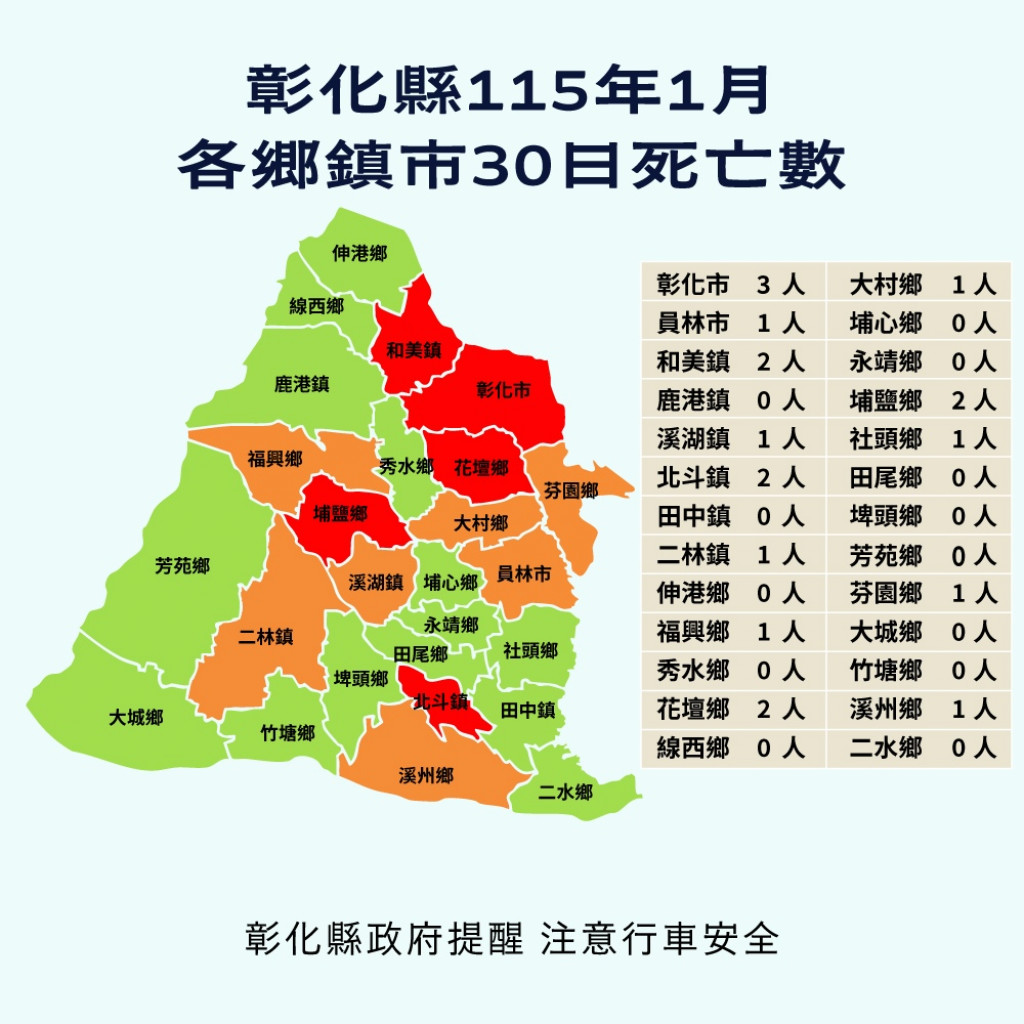 二、根據交通部道安資訊查詢網,本縣115年1月道路交通事故與去(114)年同期比較分析,以大型車造成行人涉入事故增加100%最高,少年自行車騎士(含電自、電輔) 增加67.4 %次之。微型電動二輪車(含電輔) 增加48.8 %再次之。1月份鄉鎮市30日死亡人數於「彰化市、和美鎮、北斗鎮、花壇鄉、埔鹽鄉」為多,肇事熱點以「彰化市」為多。