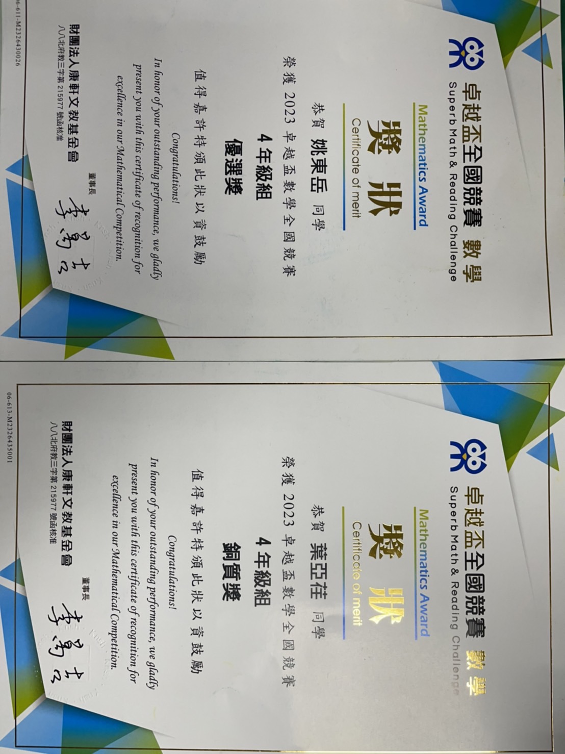 賀!!五年乙班姚佑熙、四年丁班姚東岳同學參加2023卓越盃數學全國競賽榮獲五年級組、四年級優選獎,四年丁班葉亞荏榮獲銅質獎!!